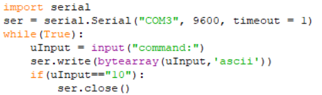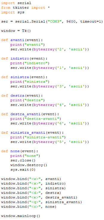 Per il codice sono state proposte più versioni, dove le prime presentavano un'interfaccia grafica abbozzata, mentre la definita utilizza una funzione per eseguire determinate istruzioni dipendentemente dal tasto che viene premuto (sulla tastiera), e logicamente noi abbiamo collegato i già canonici “wasd”, con anche i caratteri “q” ed “e” per altre opzioni, le istruzioni poi utilizzavano dei metodi di “PySerial”, che avviavano il trasferimento seriale di dati via bluetooth.