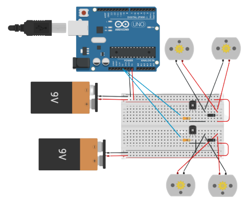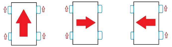 Avendo a disposizione 4 motori comandabili singolarmente, abbiamo deciso di dividerli in sezioni per lato (destra e sinistra), cosi che potessimo alimentare entrambi i lati insieme, oppure uno per volta; facendo ciò possiamo controllare il movimento della macchinina, attraverso i 3 principali movimenti: